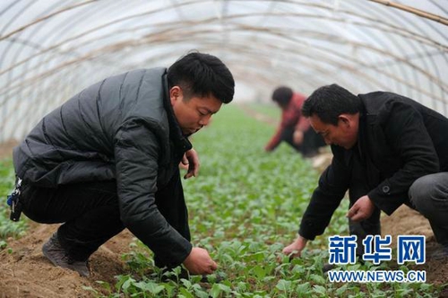 資料圖片:1月30日,王民主(左)在蔬菜大棚內(nèi)勞作。 1978年出生的王民主是安徽省宿州市埇橋區(qū)桃園鎮(zhèn)桃東村的農(nóng)民,2011年底,他與姑父、舅舅等親戚合伙湊了100多萬元,通過土地流轉(zhuǎn)的方式承包下當?shù)?00余畝土地,成立了一個現(xiàn)代農(nóng)業(yè)示范基地,當起一名家庭農(nóng)場主。 新華社記者 杜宇 攝