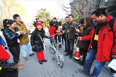 吳碧霞代表騎著自行車報道