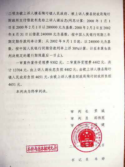 2009年,心力交瘁的謝汝忠把討賬的事托付給兒子謝振新,將鎮政府和鎮財政所訴上法庭。可官司贏了,錢依舊沒要回,反倒貼進了不少訴訟費和律師費。
