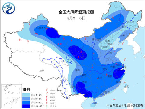全國大風降溫預報圖(4月3日至6日)