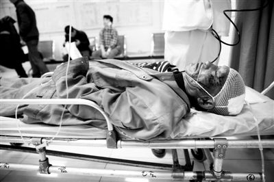 昨晚7時許,在999急救中心搶救室,王樹志躺在擔架上,正在向單位領導說明情況。其頭部包著紗布,手指縫里的血跡已經凝固。
