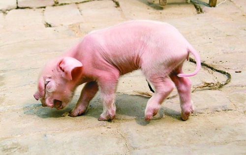 “生下這么個怪胎,鄰居們都讓我扔了,但它好歹也是一條生命,我不忍心就留了下來。”張愛花說,由于豬崽不能吃飯,她就買了些葡萄糖用針管插到它嘴里喂。頭上的畸形,造成了豬崽左眼也瞎了。“除了頭上的畸形,豬崽其他部位都很正常,走起路來也跟正常豬崽一樣。”張愛花說。