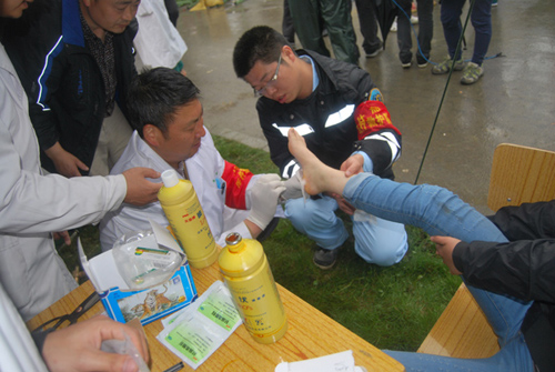 20日早上9點(diǎn),接到支援雅安的命令,很多人要求參加。最后,他們組成了一支由41名醫(yī)護(hù)人員和4臺(tái)車輛組成的隊(duì)伍,馬不停蹄趕往雅安。“真的是在和時(shí)間賽跑,心中就是想到那些等待救援的生命。下午6點(diǎn)40分,他們終于到達(dá)靈關(guān)鎮(zhèn),來不及安頓,就開始給傷員醫(yī)治。