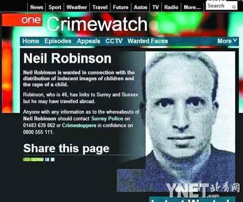 被通緝的人名叫尼爾·羅賓森(Neil Robinson),男性,46歲。在英國時他生活在薩里和蘇塞克斯地區。嫌犯的照片刊登于BBC的“Crimewatch”節目的網頁上,該節目收錄了一些犯罪現場的錄像片段,而這些片段中作案的人在逃,所以,節目借此可以“動員”觀眾發現這些面孔以助警方破案。羅賓森的照片刊登于去年9月27日。
