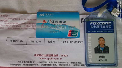 一位名為“跳樓富士康”的網(wǎng)友,自稱是死者哥哥,發(fā)微博稱“弟弟2013年4月22日入職富士康,24日晚卻跳樓身亡!”該網(wǎng)友還在微博上上傳了死者的工資卡和工牌照片,工牌上顯示“富士康科技集團(tuán),安某某,H4674257”。