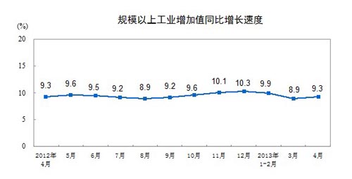 13日,據國家統計局網站消息,2013年4月份,規模以上工業增加值同比實際增長9.3%,比3月份回升0.4個百分點。從環比看,4月份,規模以上工業增加值比上月增長0.87%。1-4月,規模以上工業增加值同比增長9.4%。