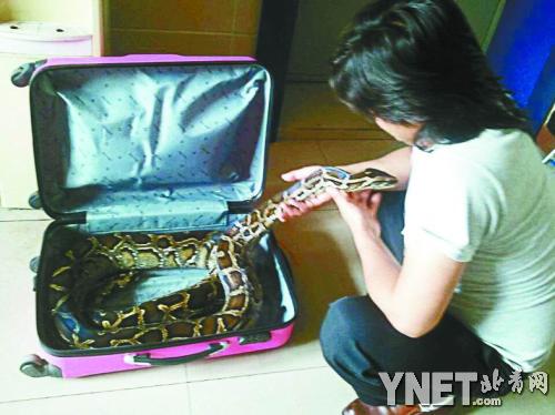 將長3.5米,重40斤的大蟒蛇藏在行李箱里,從武漢一路坐長途車到北京,昨天記者從北京警方公交總隊了解到,這兩名帶大蟒蛇坐長途車的青年已經被森林公安以非法運輸國家野生保護動物帶回繼續審查。
