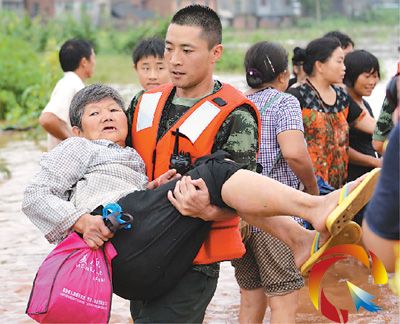 7月1日,在重慶潼南縣柏梓鎮(zhèn),消防戰(zhàn)士幫助受災(zāi)群眾走向安全區(qū)域。
