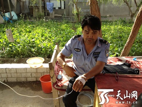 這是墨玉縣公安局芒來派出所所長艾合買提托合提·買提圖爾蓀同志犧牲前三天(7月8日)留下的照片,當時他正在派出所值班桌前打針,派出所的民警用手機記錄下了這一幕。沒想到,三天后的7月12日,他在走訪巡查期間,因過度勞累突發心臟病搶救無效,獻出年僅43歲的生命。