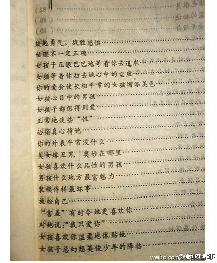 讓我們來看看“神書”都講了什么。在《怎樣征服美麗少女》的目錄裡,可以看到“鼓起勇氣,戰勝恐懼”,“正常地談些"性"”,“美女嫁丑男,奧妙在哪裡””等等。而《如何征服英俊少男》一書,開篇就直言“英俊少男在向你招手”。全書用43個故事,講述了43條“征服”的法則。在“女孩子正眼巴巴地等著你去追求”一章中,這樣寫道“絕大多數女孩的心理,都喜歡男孩能注意她,甚至主動與她說話……”在“男孩什么地方最富,魅力”一章中,性感男孩的首要條件居然是頭發,也就是發型。文中提醒,為一個好的發型,“即使多花一點錢,也不必吝惜”。