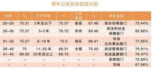 數據顯示,相比較而言政法和社會保障部門的青年公務員自信度最高。對于青年公務員來說,自信更多的是來源于工作的權力和由此帶來的各種便利和利益,而不是基于服務性和公仆性,對各項事業(yè)的貢獻、對民眾的服務等。