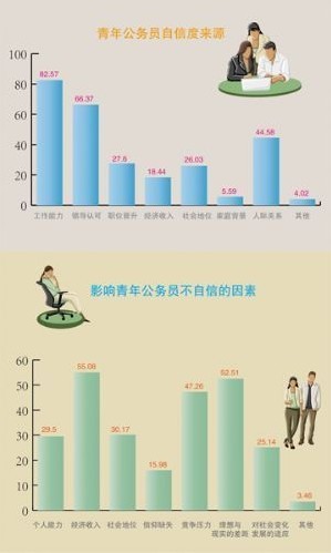調查發(fā)現,青年公務員認為影響其不自信的因素主要體現在三方面:一是經濟收入占55.08%,二是理想與現實的差距占52.51%,三是競爭壓力占47.26%。