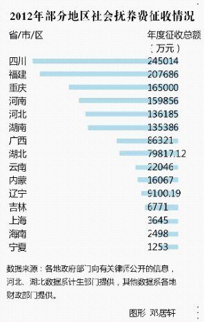 迄今已經(jīng)五十來天,吳有水陸續(xù)收到了大半的回函。截至目前,共有15個(gè)省的財(cái)政廳及計(jì)生系統(tǒng)將社會(huì)撫養(yǎng)費(fèi)2012年的收繳金額予以反饋。收入總額總計(jì)約128億元,其中四川省財(cái)政此項(xiàng)收入最高,為24億元。