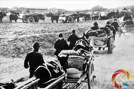 解放戰爭時期,群眾幫助解放軍運送物資。 (西柏坡紀念館館藏資料照片)