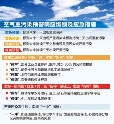 預(yù)案將空氣重污染分為四個預(yù)警響應(yīng)級別,由輕到重順序依次為四級、三級、二級、一級,分別用藍、黃、橙、紅標示。藍色預(yù)警即預(yù)測未來一天出現(xiàn)重度污染,黃色預(yù)警即預(yù)測未來一天出現(xiàn)嚴重污染或預(yù)測持續(xù)三天出現(xiàn)重度污染,橙色預(yù)警即預(yù)測未來持續(xù)三天交替出現(xiàn)重度污染或嚴重污染,紅色預(yù)警即預(yù)測未來持續(xù)三天出現(xiàn)嚴重污染。
