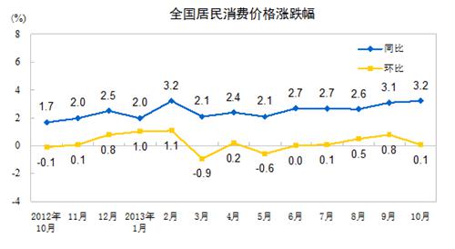 國家統(tǒng)計局今日公布2013年10月份居民消費價格變動情況數(shù)據(jù),數(shù)據(jù)顯示,10月份,全國居民消費價格總水平同比上漲3.2%。其中,城市上漲3.2%,農(nóng)村上漲3.3%;食品價格上漲6.5%,非食品價格上漲1.6%;消費品價格上漲3.2%,服務(wù)價格上漲3.1%。1-10月平均,全國居民消費價格總水平比去年同期上漲2.6%。
