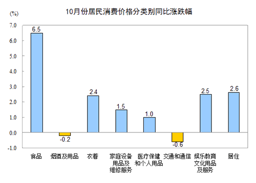 10月份,非食品價格環(huán)比上漲0.3%。其中,衣著、娛樂教育文化用品及服務(wù)、居住、家庭設(shè)備用品及維修服務(wù)、醫(yī)療保健和個人用品價格分別上漲1.0%、0.8%、0.2%、0.1%和0.1%,交通和通信價格下降0.3%,煙酒及用品價格持平。