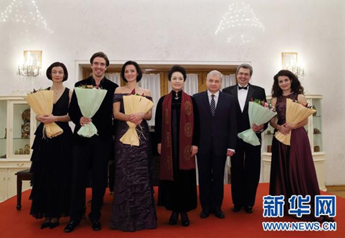 這是演出結束后,彭麗媛同俄羅斯歌唱家合影。新華社記者蘭紅光攝