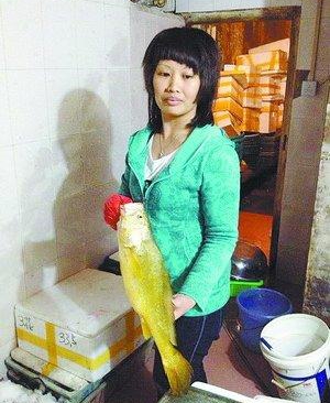 攤主展示這條“土豪金”黃花魚。