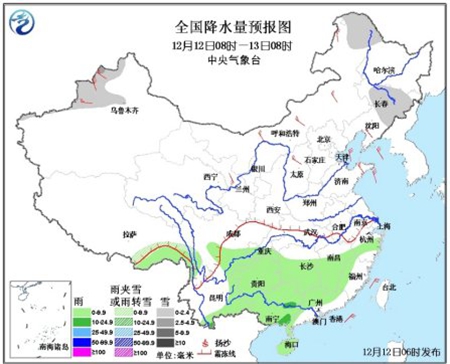 12日08時至13日08時,新疆西部、內蒙古東北部、黑龍江西北部、吉林大部、山東半島北部等地有小雪或陣雪;西藏東南部、西南地區東部、江南大部、華南大部等地有小雨或陣雨,局地有中雨。新疆西北部、內蒙古中東部、東北、華北、山東半島等地有4~5級偏北風。南海東北部有6~8級、陣風9級的風。