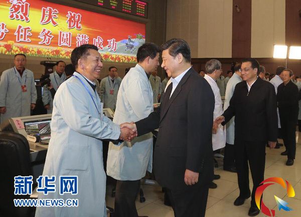 12月15日,中共中央總書記、國家主席、中央軍委主席習近平,中共中央政治局常委、國務院總理李克強到北京航天飛行控制中心觀看嫦娥三號著陸器、巡視器互拍成像,向全體參研參試人員表示熱烈祝賀和誠摯慰問。新華社記者丁林攝
