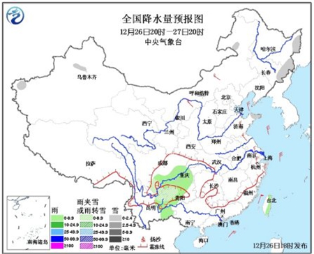 中央氣象臺(tái)發(fā)布最新天氣預(yù)報(bào),預(yù)計(jì)26~27日,冷空氣繼續(xù)東移南下影響南方地區(qū),江南、華南等地氣溫將下降4~6℃,中國(guó)東部和南部海區(qū)有7~8級(jí)風(fēng);云南東北部、貴州西北部地勢(shì)較高的地區(qū)有雨夾雪或雪,局地凍雨。