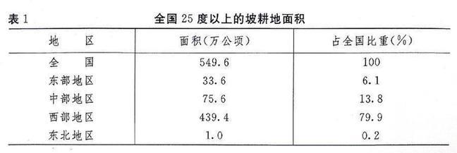 全國耕地按坡度劃分,2度以下耕地7735.6萬公頃(116034萬畝),占57.1%;2~6度耕地2161.2萬公頃(32418萬畝),占15.9%;6~15度耕地2026.5萬公頃(30397萬畝),占15.0%;15~25度耕地1065.6萬公頃(15984萬畝),占7.9%;25度以上的耕地(含陡坡耕地和梯田)549.6萬公頃(8244萬畝),占4.1%,主要分布在西部地區(見表1)。