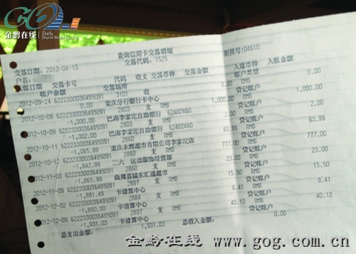 25號(hào)下午,記者在唐先生打印的工商銀行分理點(diǎn)提供的信用卡交易明細(xì)單看到:尾數(shù)為95091的這張信用卡,出自重慶分行銀行卡中心,辦卡時(shí)間是2012年9月24日。第一筆消費(fèi)為10月9日,在重慶分行銀行卡中心透支1000元,之后又在巴南李家沱自助銀行透支2次,共65.99元,另外三次分別在重慶永輝超市、二六運(yùn)動(dòng)服飾和曲州縣城東匯通超市消費(fèi)共815.5元,截至2012年12月9號(hào),加上滯納金,總共欠下了1931.03元。