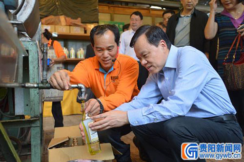 陳敏爾省長觀看新煉出的苦茶油 黃曉青 攝