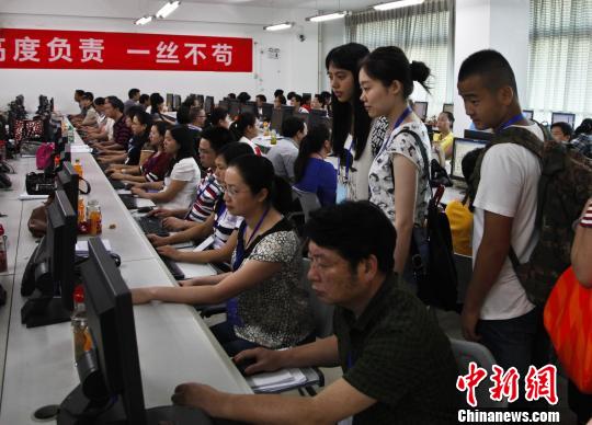 記者看到,評卷大樓已經(jīng)圍上警戒線,必須佩帶證件才能進入,大樓里的實時監(jiān)控可以看到各個評卷現(xiàn)場。2013年貴州省繼續(xù)實行網(wǎng)上評卷,評卷現(xiàn)場,偌大的教室一行行坐著經(jīng)過嚴格審查的評卷老師。安靜的閱卷室里,只有評卷老師按敲打鍵盤的聲音。