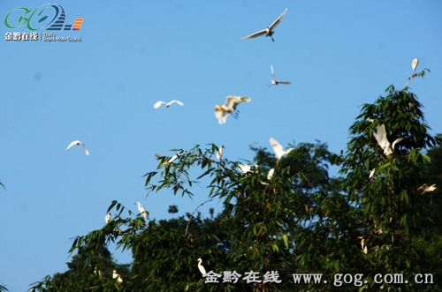 6月16日黃昏時(shí)分,筆者在德江縣潮砥鎮(zhèn)石板村烏江岸邊目睹了群鳥歸巢的美麗自然風(fēng)景,在夕陽(yáng)照射之下,數(shù)千只白鷺有的在江面上空盤旋,有點(diǎn)棲居在岸邊竹林叢中的兩棵相思樹(shù)上。