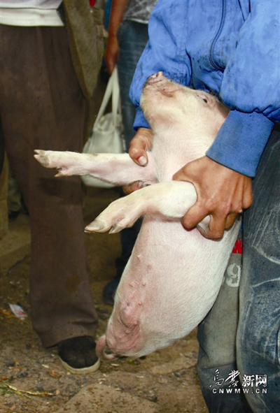 李四國說,這頭小豬一生下來就是這樣,20多天了,它和其他兩頭小豬一樣健康。周邊很多村寨的村民聽到這樣的“怪事”,都紛紛趕來看熱鬧,20多天時間里聞訊來“欣賞”這頭“怪豬”的村民就達到六七十人。