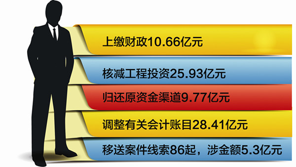 2012年6月至2013年5月,已上繳財政10.66億元,核減工程投資25.93億元,已歸還原資金渠道9.77億元;已調整有關會計賬目28.41億元;共向紀檢監察、司法機關和有關部門移送案件線索及事項86起,涉及金額5.3億元。