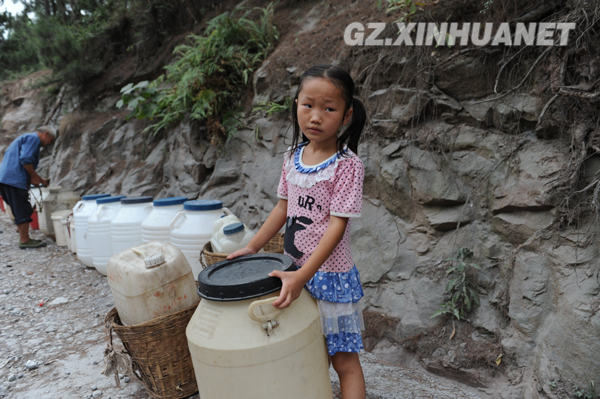 7月26日,桐梓縣高橋鎮(zhèn)龍爪村留守兒童牟紅艷在等待送水。當(dāng)?shù)卮迕裾f,自6月以來井水枯涸,生活用水靠政府組織水車運送。新華社記者 王念 攝