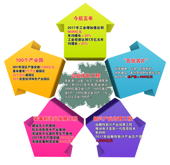 為達到目標,我省將實施100個產業園區成長工程,承接東部產業轉移;實施“五張名片”產業提升工程;實現煤電磷、煤電鋁、煤電鋼、煤電化一體化協調配套發展,到2017年,總產值突破5000億元;實施軍民融合推動裝備制造業發展工程;實施戰略性新興產業培育工程;實施企業成長工程。