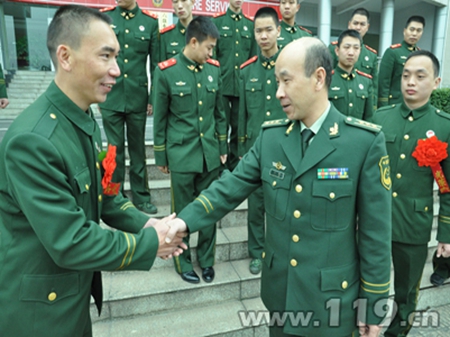 圖為支隊長與退伍老兵握手告別