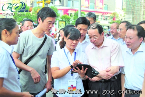 國家統計局副局長李強在試點現場觀看普查員操作PDA。