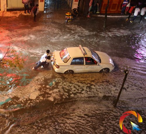 據介紹,事發當晚9時30分許,因突降暴雨和冰雹,鎮遠三小附近的路面低洼處積水,足以淹沒半個車輪子,一輛出租車“不知深淺”,進入水中,不料車輛“濕身”熄火,被積水包圍,無他脫身。