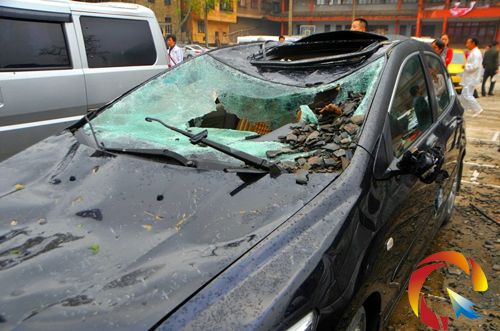 在鎮遠體育館,記者看到,停放在廣場的不少車輛受損,其中一輛外地旅游車受損嚴重,車窗玻璃、擋風玻璃破碎,板筋起了窩宕,車內一片狼藉。