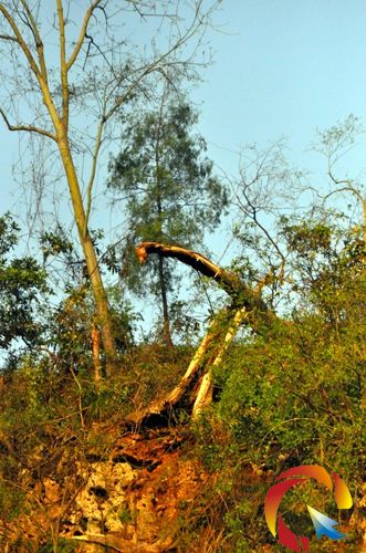 災害發生后,青龍洞景區多株風景樹轟然倒下,其中還有一些是古樹。記者在鎮遠大河關處看到,一株生長在青龍洞崖壁上的古樹倒下之后,主干下部撕裂成兩岔,遠觀就像一條巨蟒在張著血盆大口(如圖)。