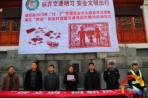 12月2日上午,鎮(zhèn)遠(yuǎn)縣公安局交警大隊(duì)和縣“文明辦”在該縣“鎮(zhèn)遠(yuǎn)劇場(chǎng)”門口共同隆重舉行“鎮(zhèn)遠(yuǎn)縣2013年‘122’全國(guó)交通安全日主題宣傳暨城區(qū)和農(nóng)村道路交通違法大整治”活動(dòng)啟動(dòng)儀式。