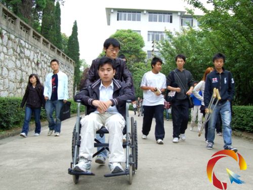 在大學(xué),母親當(dāng)起了兒子的雙腿。每天一大早就將兒子背下宿舍樓,直至背到教室,傍晚又將兒子從教室里背出來(lái),再背進(jìn)宿舍……