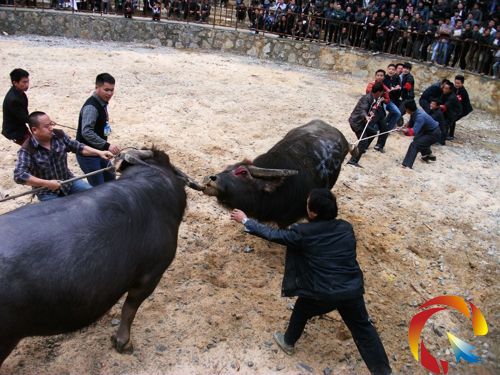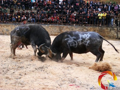 一番激戰,決出勝負。敗者倉皇逃離,而勝者乘勝追擊。這時,工作人員便用特制的工具將獲勝的牛頭控制。經過9輪精彩激烈的比賽,勝、負、和各有定論。(諶鴻溪)