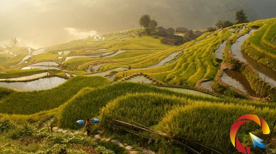 村寨、稻谷、農民和諧景象