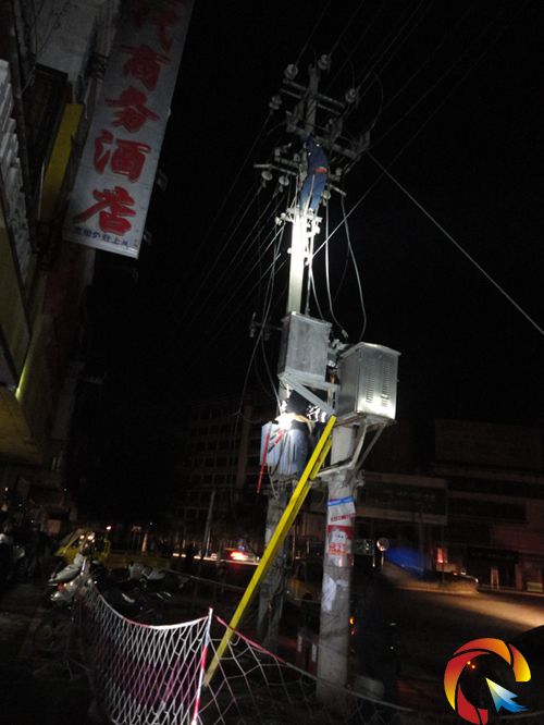 本網訊 12月18日晚,從江縣10千伏城環線現代超市門口臺變低壓引流線零線不堪重負自燃,導致線路停電。從江供電局丙妹供電所接到報修后立即組織人員前往現場搶修,及時恢復供電。
