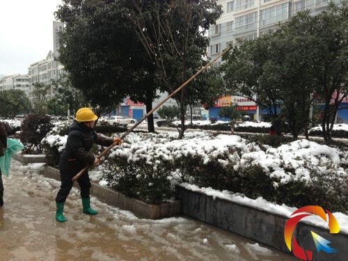 天降大雪,大量雪花降落在城市街道的行道樹上,壓彎了樹干樹枝,少量行道樹被壓斷。為了減輕這些行道樹的負擔,避免因樹斷造成經濟損失,黃平縣園林部門組織工作人員走上街頭,去除行道樹上的積雪。而在去除積雪時,工作人員使用的“武器”就是長2一3米的竹竿子。圖片為工作人員提竹竿清理積雪的情景
