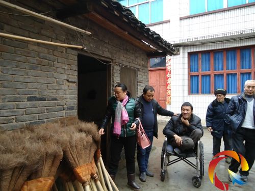 縣殘聯干部在仔細查看楊再貴做的掃帚