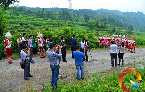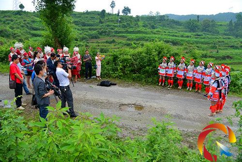 在飛云崖景區外老公路旁的拍攝現場,采風組被一首首旋律優美的苗、革情歌、飛歌所吸引,一個個民族風情濃郁的精彩場面也被鏡頭所記錄。
