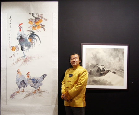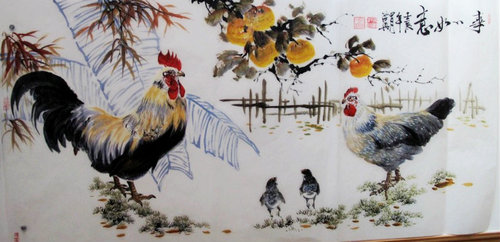 沒有量的積累就沒有質(zhì)的爆發(fā)。孫洪興就是這樣通過不斷地從大自然和其他民族藝術(shù)及流派中汲取營(yíng)養(yǎng),而不斷發(fā)展,不斷創(chuàng)新,不斷完善自己,不斷超越自己。應(yīng)該說,最能體現(xiàn)這種創(chuàng)新和超越的,就是孫洪興筆下的雞。畫雞的畫家很多,如古代的梅行思、母咸之,當(dāng)代的凌立如、楊建臣等,然而孫洪興畫的雞卻與眾不同。他畫雞的工具是毛筆、油彩和宣紙——毛筆蘸油彩,在宣紙上作畫,這是孫洪興的大膽嘗試。西方油畫的顏料與中國傳統(tǒng)畫的毛筆和宣紙的組合,為他的創(chuàng)作開辟了一方嶄新的天地,當(dāng)走入這片天地后,孫洪興發(fā)現(xiàn)原來這里更加天高地闊、景色無限,可任由自己盡情翱翔。