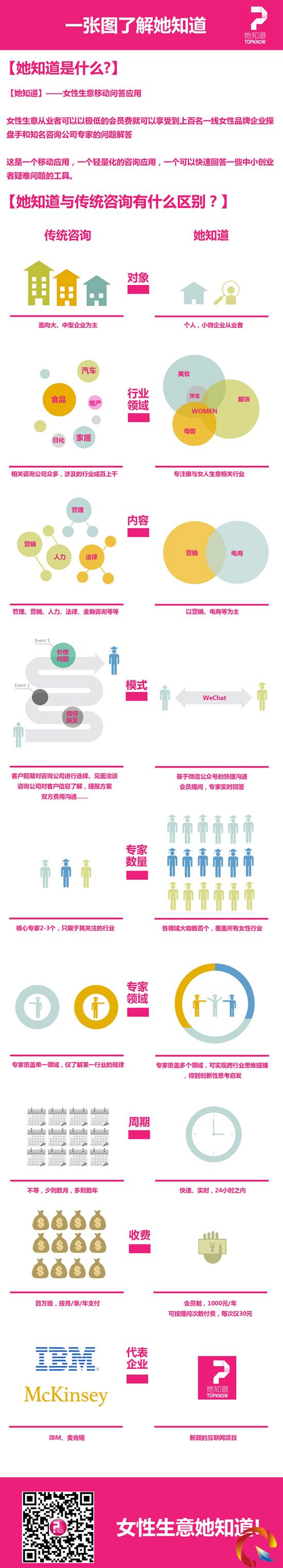 相對而言,她知道走的是避重就輕的路子。目標用戶是從事女人生意的創業者、從業者。它不再提供具體的解決方案,而是把重點放在快速、便捷上,提供的是基于專家經驗和智慧的點撥式回答,更側重于判斷和方法。這是她知道獨特的用戶價值所在。